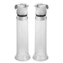 With proper use you can enlarge and stimulate your nipples using our high tech vacuum pump. The pair of cylinders is crafted from industrial grade clear acrylic. Uses the same airlock release system as in our penis pumps. A dual T connecter is recommend to enlarge both nipples evenly and to insure constant pressure. Enjoy watching your nipples grow with proper use. Enhance sensitivity of the nipples. Can be used to create great stimulation or punishment with higher pressure levels. We offer two sizes. The beginner size cylinder will make the nipples more elongated after suctioning. The advanced cylinder will make the nipple stout. Advanced size is the most popular, yet some customers choose both sizes so they have the tools to better customize the shape of their nipples.