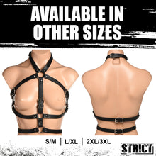 Spice up your look with this harness! First, tighten the straps around your neck so only one or two fingers can slip in between your neck and the faux leather. Then slip the triangular straps around your breasts and pull the straps together behind you. Buckle the top and then the bottom straps and adjust as needed. Grab a pair or cuffs and a connector to hook them all together. Then invite your Dominant partner to come and play! They'll love the way you look and how easy it is to keep you bound to your own harness!