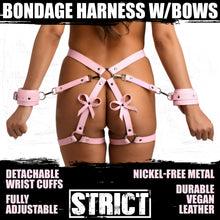 The use of your body is a gift; treat it like one with this bondage harness and wrap up your waist, thighs and wrists like a nice, little package -it even has bows included! Made out of pink, durable PU faux leather, it is vegan friendly and easy to spot clean or wipe clean after each use. The wrist cuffs close using nickel-free, silver colored metal buckles. Adjust the buckles on the thigh straps, waist strap and wrist cuffs for a custom and comfortable fit. Accentuate your curves and make your partner drool with lust and desire as you present yourself as the object of their admiration, a bound and submissive playmate ready to spice up the night!