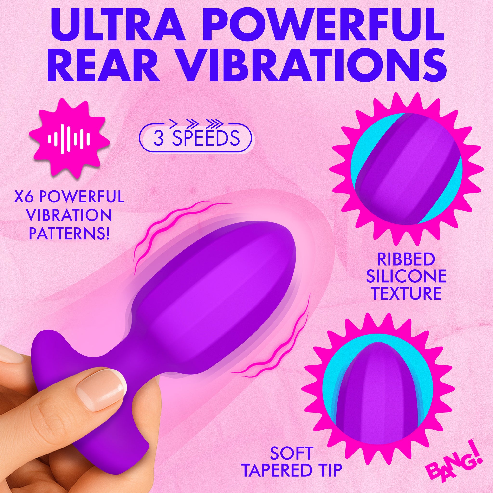 The Bang! Ribbed Vibrating Silicone Butt Plug is a rechargeable anal vibrator in premium body-safe silicone and ABS plastic. The ribbed shaft is the defining feature: raised texture along the 2.8 insertable length adds friction and stimulation at every stage, from initial insertion through extended wear to removal, giving each experience a tactile depth that smooth plugs do not offer. Nine vibration functions — three speeds and six patterns — amplify that texture further, sending vibration through every rib and into the surrounding muscle throughout wear. The tapered tip makes insertion comfortable for first-time users, while the full 1.3 widest diameter and ribbed profile satisfy experienced users looking for more. Flared base for safe solo or partnered use. IPX6 waterproof. USB rechargeable, 60-minute charge, 90-minute run time. Phthalate-free throughout.