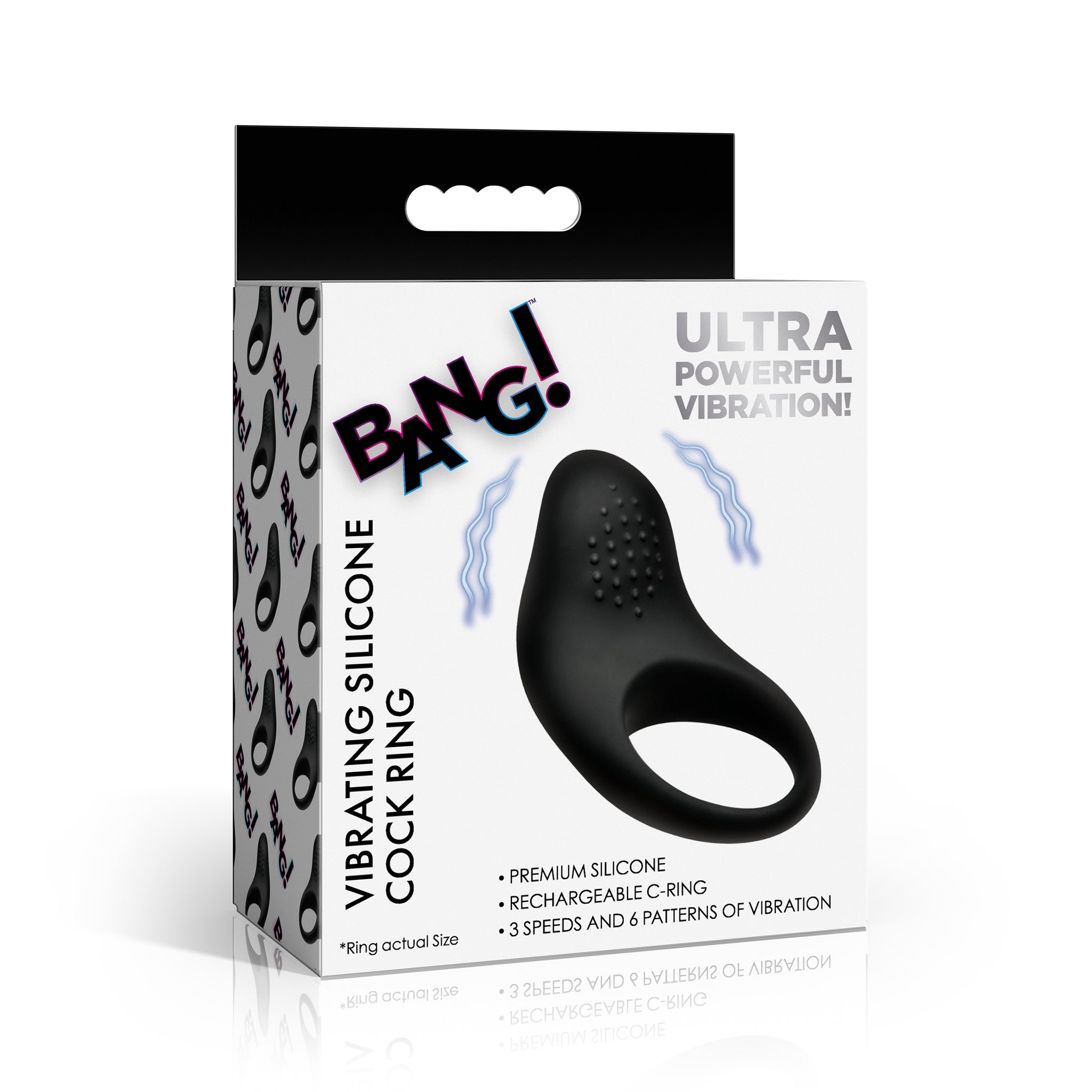 The Bang! Vibrating Silicone Cock Ring is a rechargeable couples vibrator built from premium body-safe silicone and ABS plastic. The soft clitoral stimulation pad sits flush against the body during penetration, delivering direct vibration to the clitoris from the same motor that the wearer feels through the ring. Ten vibration functions — four speeds and six patterns — give both partners full control over intensity and sensation, from a subtle, shared buzz to strong, focused vibration that builds toward climax. The 1.4 stretch silicone ring maintains firm, consistent positioning throughout wear, keeping the stimulation pad in contact exactly where it counts. Splash proof for easy cleanup. USB rechargeable, 90-minute charge, 60-minute run time. Phthalate-free throughout.